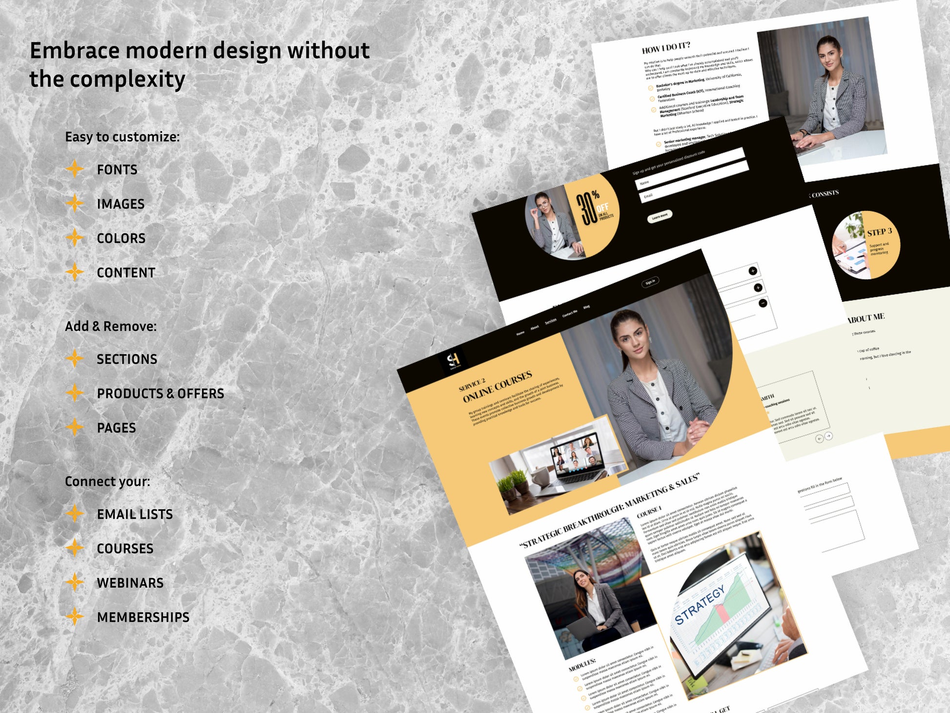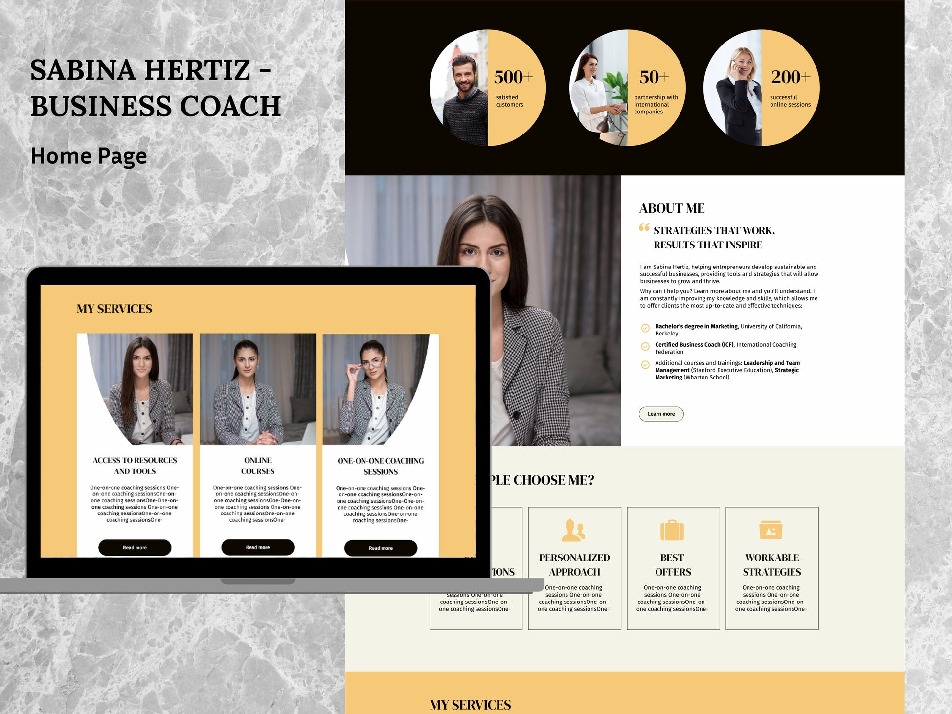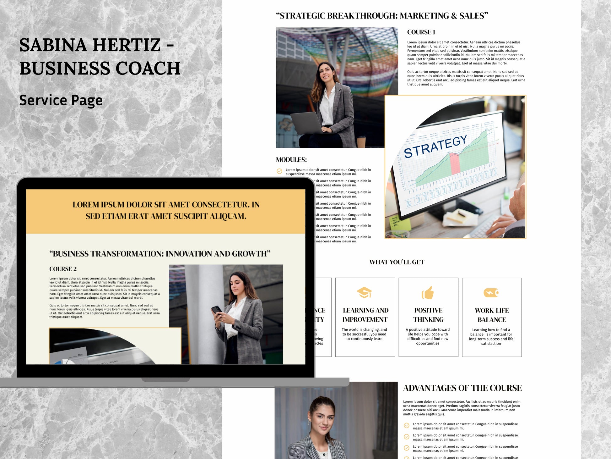 This template is perfect for business coaches who want to stand out. Its dynamic design, with bright yellow accents, creates an atmosphere of energy and optimism.