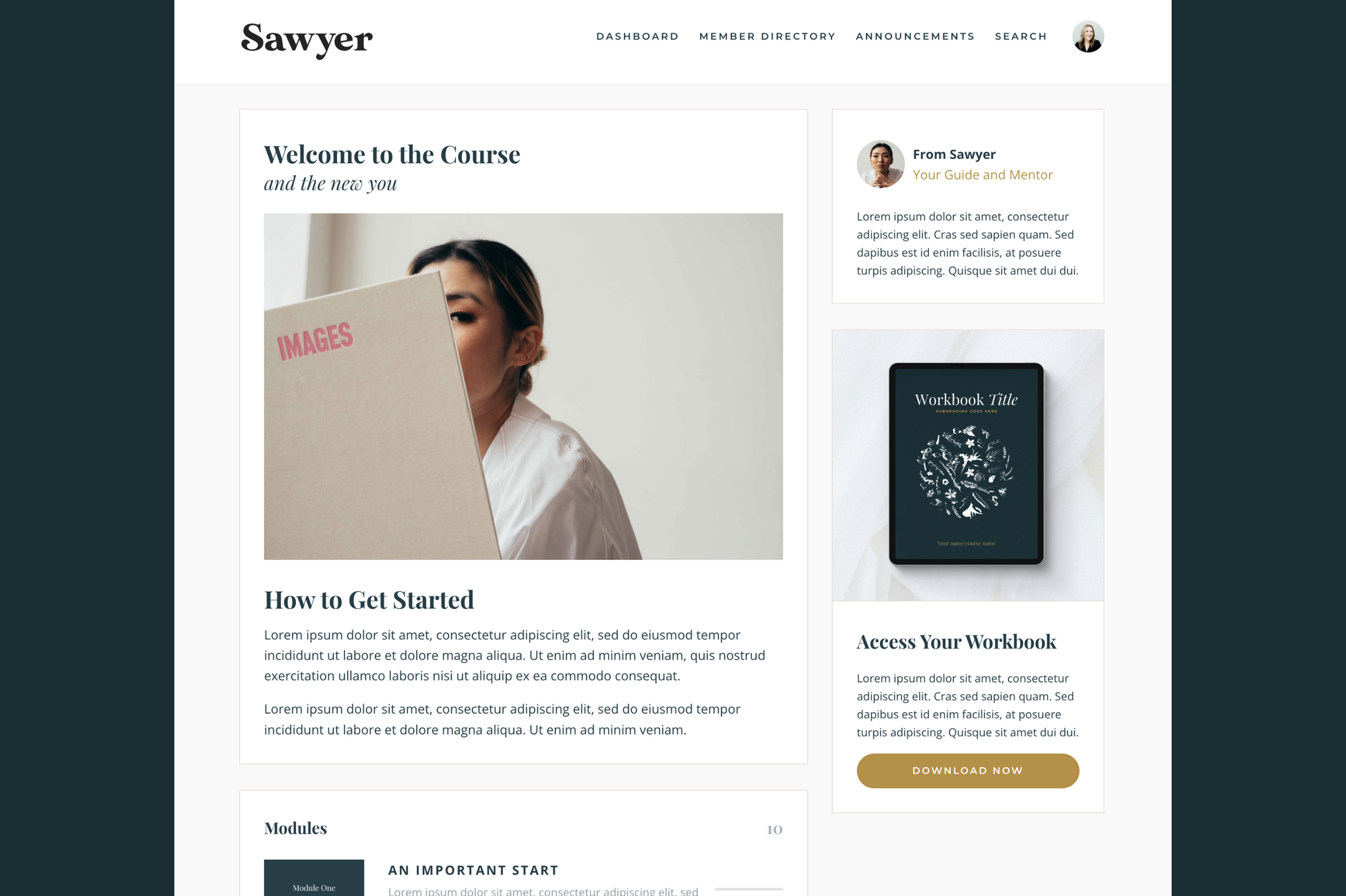 With a beautifully refined design, created with dark greens and rich gold, the Sawyer Kajabi Product Template is perfectly ready to launch your course, program, or membership.