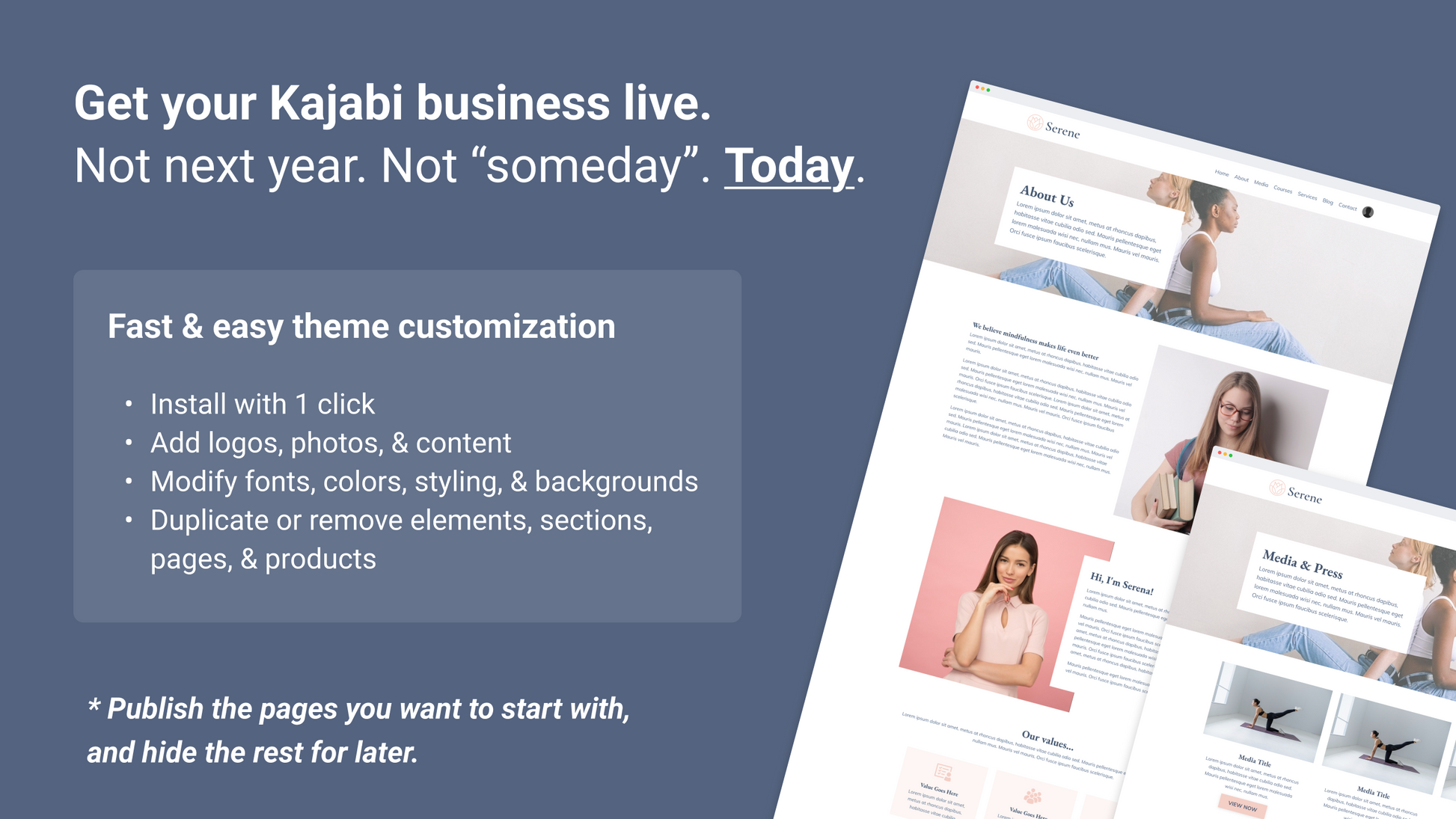 Yes. This website theme is built on top of Kajabi's default Encore Theme, so you have the same freedoms of customization. It's super easy to swap in your logo, colors, images, and copy.